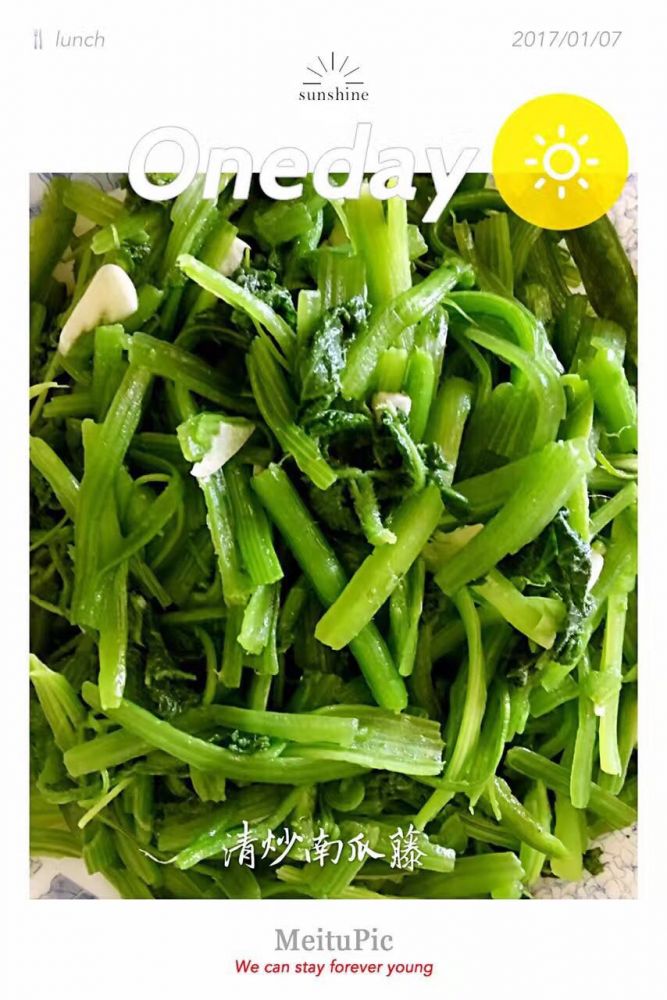 辣椒炒南瓜藤~南瓜藤、辣椒、蒜、盐。首先将南瓜藤上面的绒毛的外皮。一条一条的撕下来,要撕干净,老的根茎也要除掉不然会影响口感。不爱吃叶子的也可以将叶子剔除,如果保留叶子的话选择比较嫩的而且在清洗的时候要轻轻搓洗叶子以便洗去上面的绒毛。将择好的南瓜藤用清水清洗干净沥干水分,蒜头切成小片,辣椒切成丝。在热锅中倒入油,再加准备好的蒜头和小辣椒,翻炒爆香。接着倒入南瓜藤,继续翻炒至根茎变软,此时加入少许的盐,炒均匀即可装盘。这道菜有润肺化痰的功效