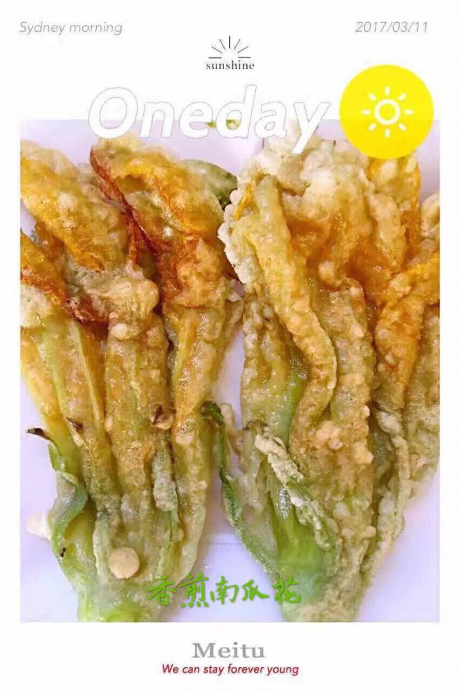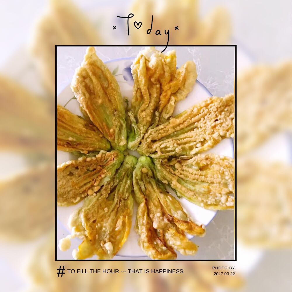 油煎南瓜花~南瓜花去掉花芯,轻柔地将南瓜花冲洗干净,控干水分。三勺面粉两勺生粉加两个鸡蛋、盐和胡椒粉调成糊状,将南瓜花挂糊,平底锅放比平时炒菜略多些油,轻轻放入挂好糊的南瓜花,煎至两面金黄即可。