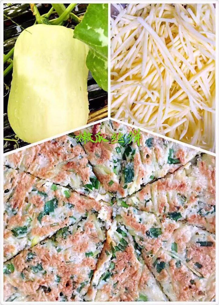 嫩瓜丝饼~嫩南瓜半个洗净去皮刨成丝,加入适量的面粉、少许盐、3个鸡蛋、水和韭菜末或葱末混合均匀调成糊状。平底锅放少许油倒入混合面糊,抹均匀中小火煎至两面金黄边上有点微焦就好了。