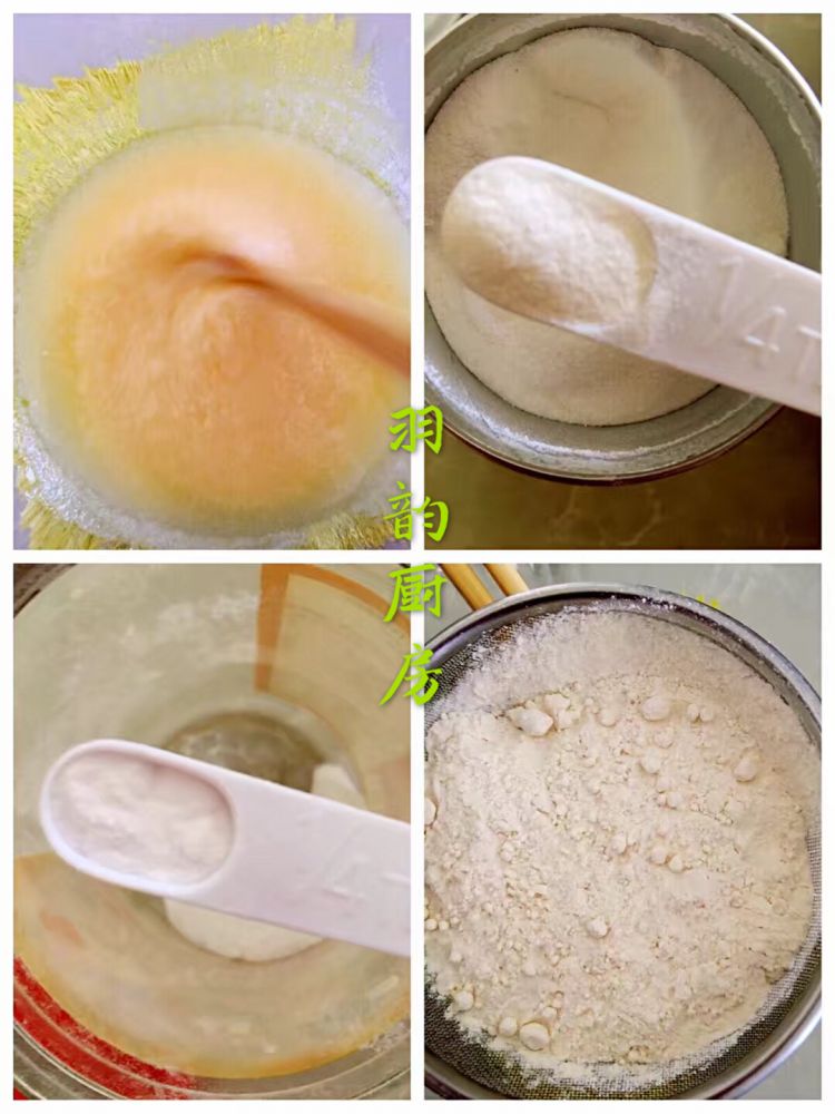 2、面粉和泡打粉、小苏打混合均匀,过筛。