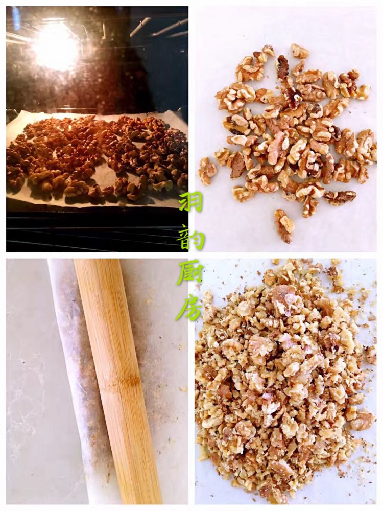 配料:普通面粉240克,细砂糖100克,植物油110克,打散的鸡蛋20克,核桃碎60克,泡打粉1/4小勺,小苏打1/8小勺