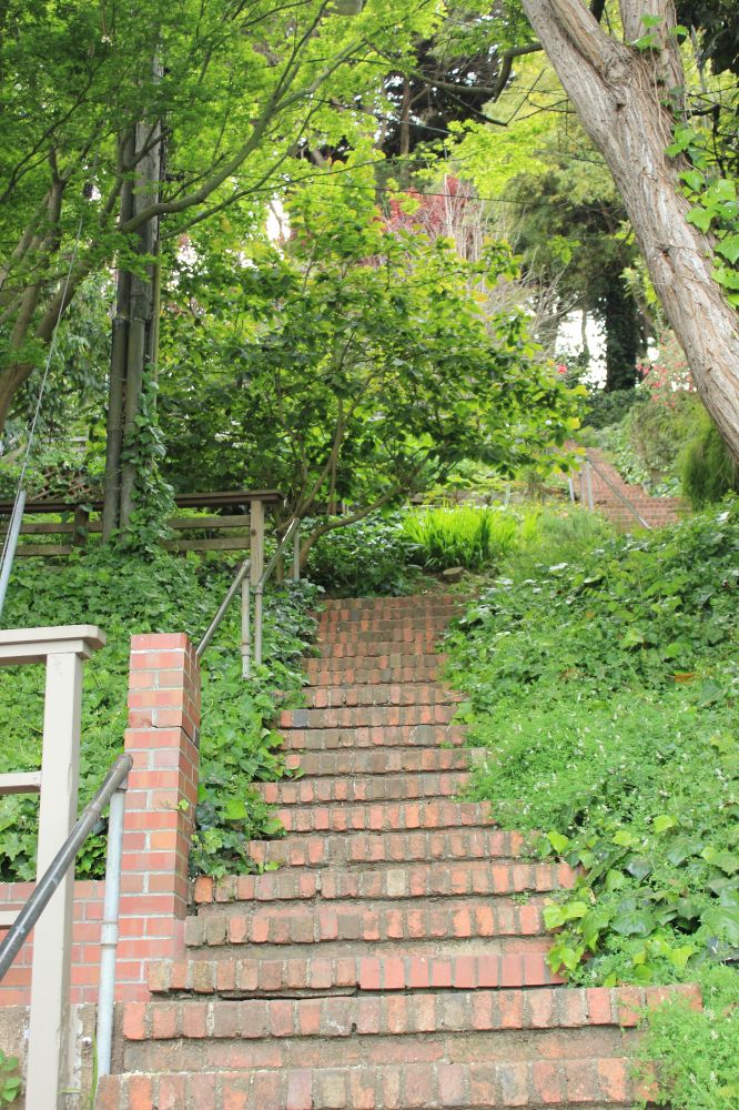 9. 旧金山多山,上上下下有很多的长长的陡峭的楼梯(STEPS)可以抄近路。我们这次从TELEGRAPH下山走的不知道是不是著名的STEPS之一 FILBERT STEPS。事后查INTERNET知道可能不是,但是已经是非常惊艳了。体会到在旧金山每一个角落都有可能有一些HIDDEN JEWELS。不过这些只有步行才可以经历,驾车绝对不会体验到这种好处了:)