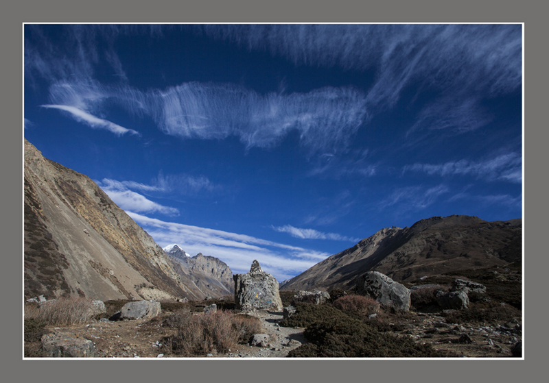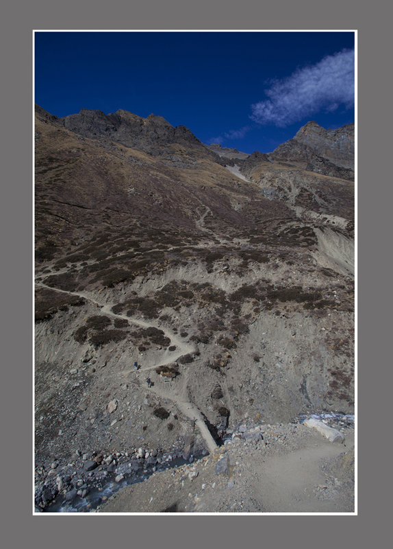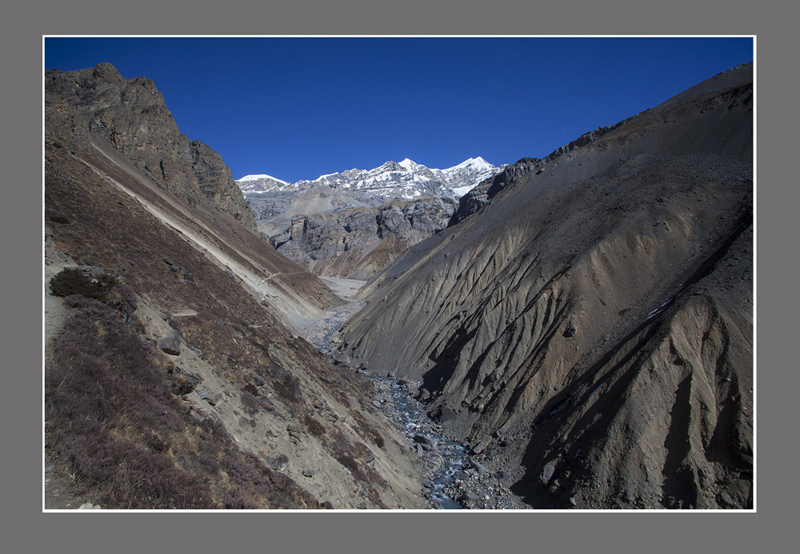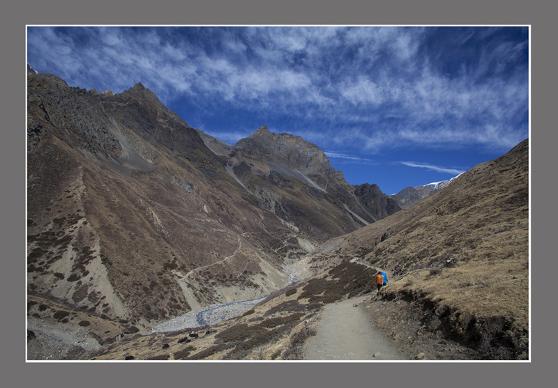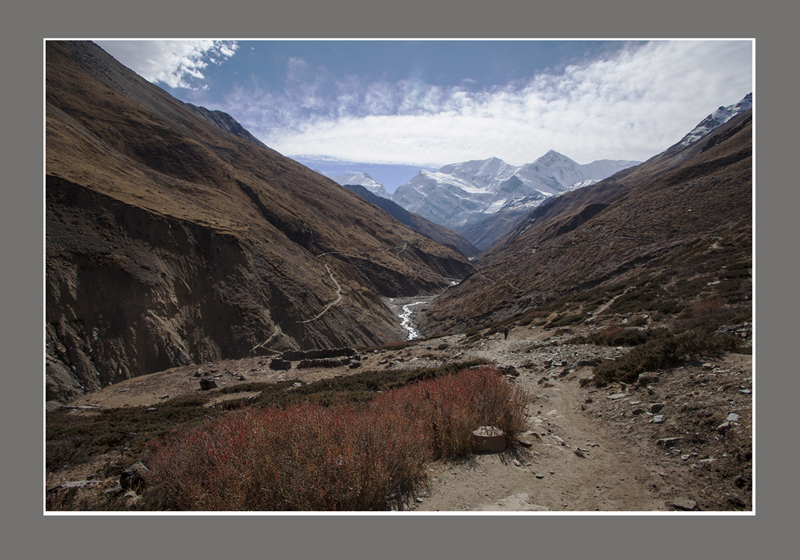大环徙步的终极目标是陀龙山口(Thorong La Pass),5416米是考验人的体力和意志的地方.告别马兰一路上行,天气出奇的好,阳光明媚而温和,虽然已是十二月,身处4千多米的高山也不觉得寒冷.路向峡谷深处延伸.