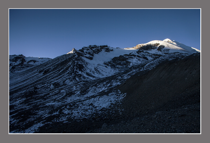23.5千多米的高山上没有植被,满山满野的砾石,如巨大的采石场,又如行走在外星球,太阳终于升起,金色的阳光洒在高高的山尖上