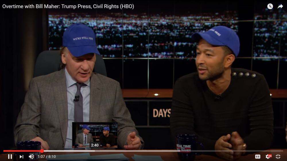 其实,所有脱口秀主持人在川普竞选期间就已经八仙过海,各显神通,川普当选总统,他们有的是依照惯性,再接再厉,有的则把对竞选结果的失望转化成了更多的犀利的玩笑。Bill Mahr模仿川普那顶写着“Make America Great Again”的小红帽,做了一顶写有“We’re Still Here”的蓝帽子,每位嘉宾都发一顶: