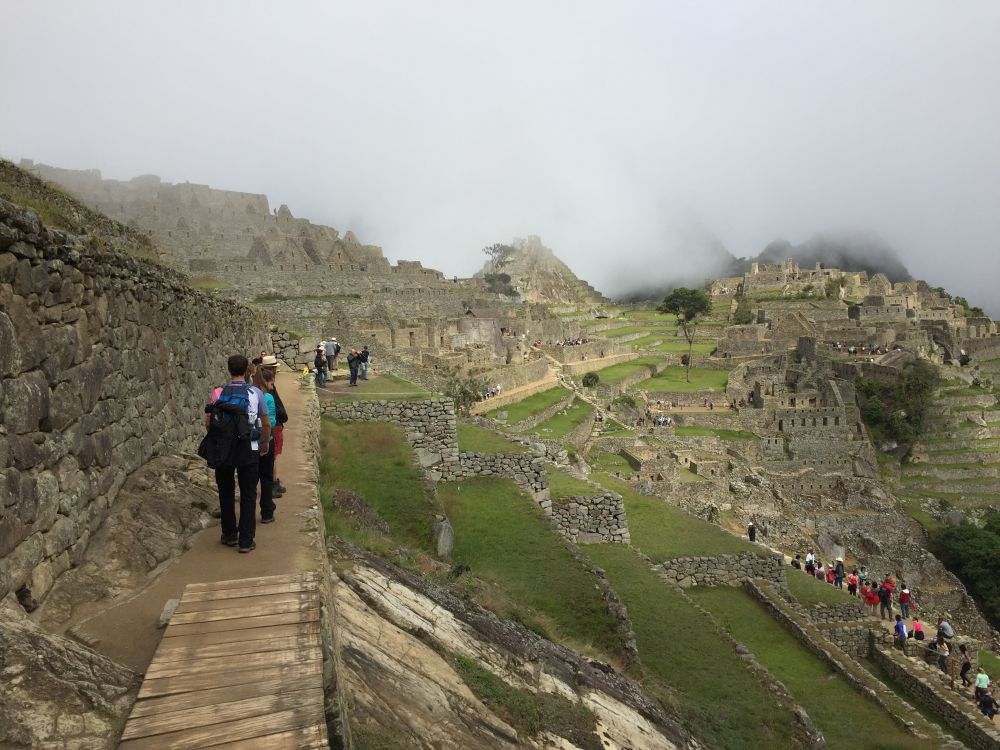 马丘比丘是印加人于1450年左右建成的,一般认为是库斯科的印加贵族的度假之地。印加人在此居住100余年后,因西班牙人入侵才离开,也有人猜测他们感染西班牙人携带的病毒毙了命。西班牙人登陆南美后,沿着印加小径发现了几乎所有印加帝国的重要城市,顺手将它们摧毁无遗。那些用上好石材建成的城堡,成了西班牙人的建筑材料基地,难怪库斯科和我们游览的另一座秘鲁大城市Arequipa都有气派的中心广场,漂亮的西班牙式建筑,和鹅卵石铺就的古雅街道。我们只能庆幸西班牙人没有发现马丘比丘,否则世界上会多一座硕大的天主教堂,而马丘比丘将不复存在。