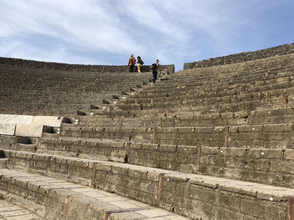 我们在一个风和日丽的日子游览了庞贝。因为之前没有做足功课,我们是从庞贝考古公园的后门进去,从前门出来的。但因为这种反潮流的走法,反而有了一种倒吃甘蔗、越吃越甜的感觉。我们首先瞻仰了竞技场和葡萄园,然后看到很多街道民居别墅,再参观小剧院,大剧院,又看到神庙,最后来到城市广场。每到一处,我们都感叹建筑的典雅考究,以为再也不可能看到更精彩的古建筑,但下一站却更让人惊艳。