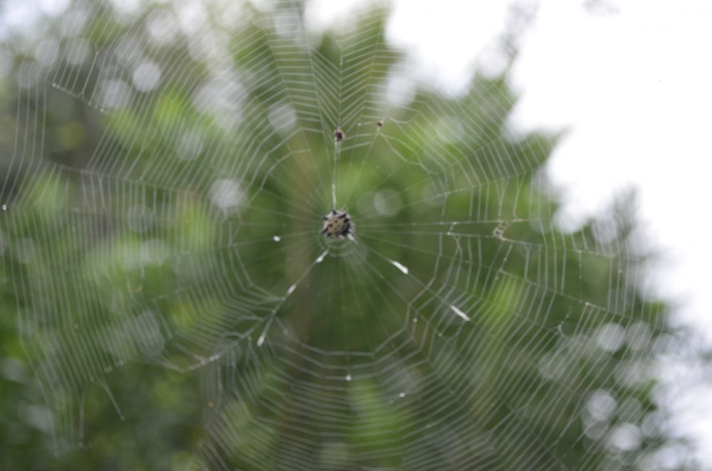 我顿时心血来潮,想将如此精美的蜘蛛网和这一聪明的蜘蛛拍摄下来。于是将我的那个单反相机拿了来。虽说是单反相机,自打买了以后,一直将转盘放在自动档上,当成傻瓜相机使用。借口是“没有时间来研究如何使用”。我将镜头对准了蜘蛛网,可是怎么也对不好焦距。那个自动对焦的功能,完全无法知道我此时是要以这半透明的蜘蛛网为摄影对象。即使我好不容易对到蛛网,并立时放开对焦钮,在按快门时,相机居然会自作主张再一次把焦距对到蛛网后的篱笆上。几次失败后,没有气馁。我一不做二不休,将相机手册又去翻了出来,研究如何人工摄影和人工对焦。 天下无难事,琢磨一番,就找到了一点儿門道。拍出了还看得过去的蛛网照片。但总觉得没啥艺术性。这时灵机一动,何不上网看看人家如何拍蜘蛛网。 于是回室内去“狗狗”一下,网上有人说下小雨后拍蜘蛛网最好。可那有这么巧,老天今天就立马给下点雨。看来只能罢了。