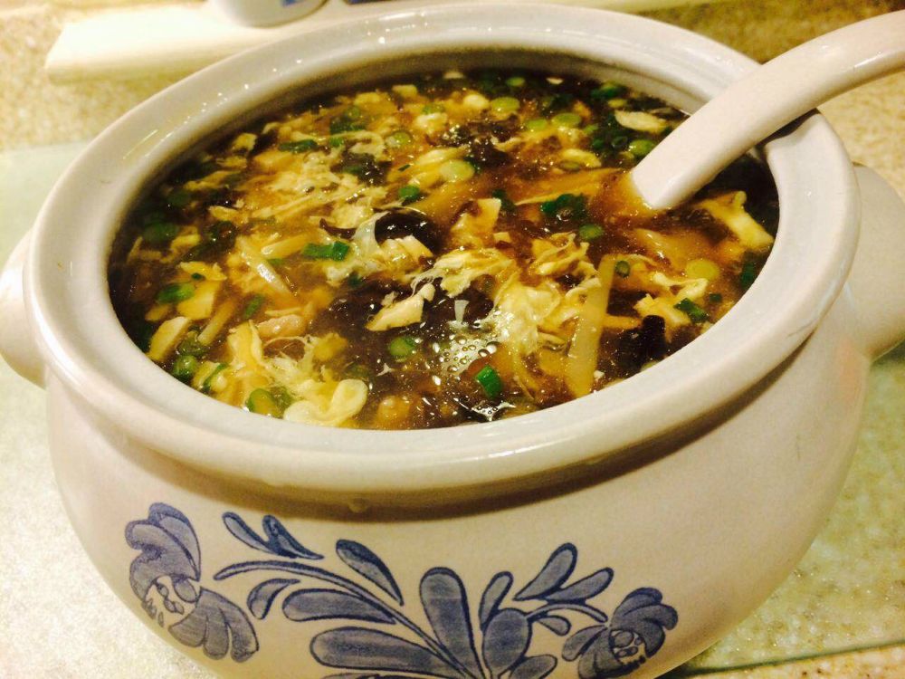 刚做好的酸辣汤。这个已经得心应手啦,今天没肉丝笋丝也没关系。用罐头鸡汤加水,煮开加酱油,白胡椒粉调味,再加香茹丝,木耳丝,豆腐丝,胡萝卜丝,煮熟勾芡,加蛋花,加醋,最后洒葱花,滴麻油。暖暖的一大锅,秋冬必备哦!