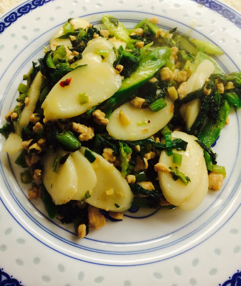肉丝炒年糕,自己腌的萝卜缨哦!