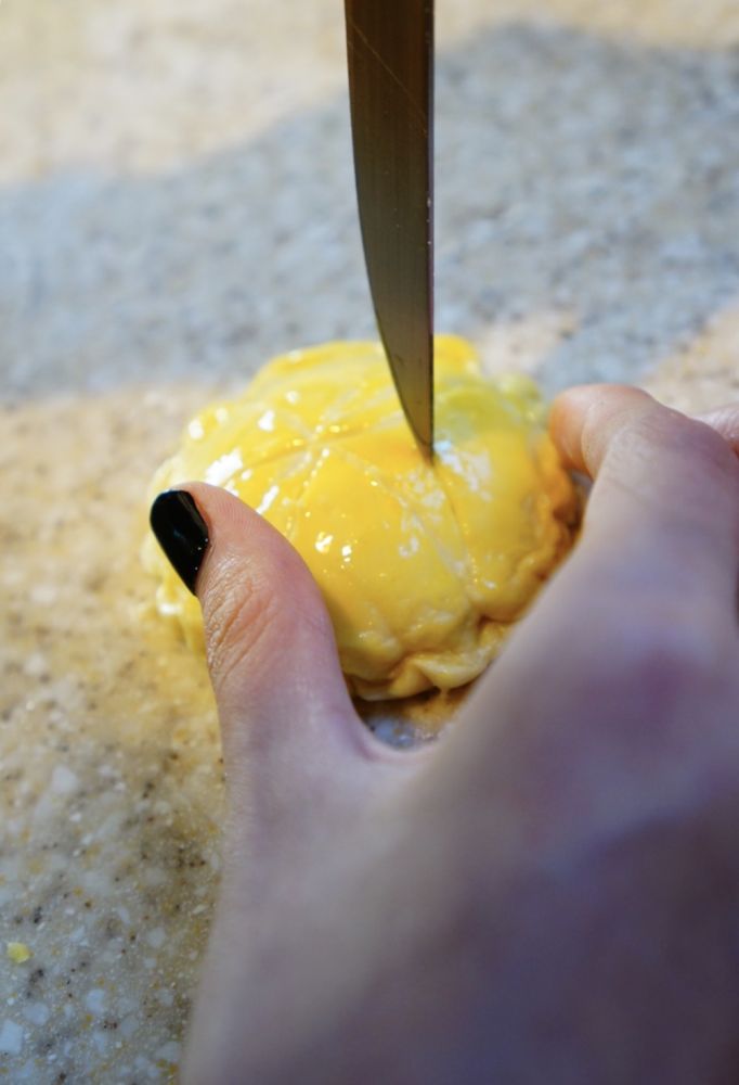 3 包起来以后刷蛋液,再用刀尖刻出花纹
