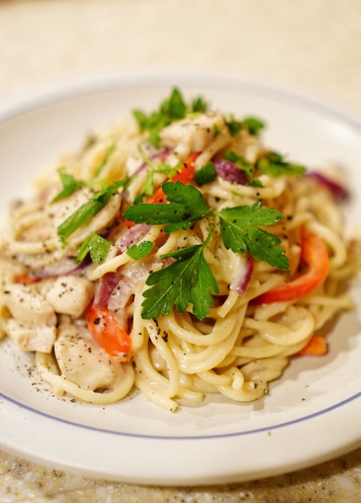 13 扬州姑娘的白汁意面,等量黄油面粉混合,加牛奶搅拌变厚,加盐胡椒调味。炒洋葱,鸡丁,蘑菇红椒,最后和面混合即可。