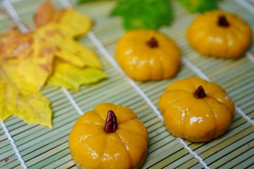 2 紫色南瓜:用煮熟的紫薯加糯米粉做成糯米团,包豆沙馅,揉圆,用刀压几道,蒸十分钟。