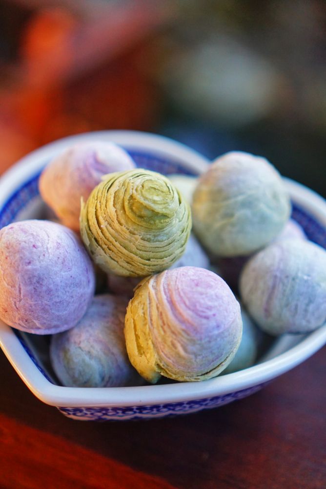 9 冰皮月饼,和上面紫薯酥一样,深深浅浅的紫,绿色是用的抹茶粉,褐色可可粉