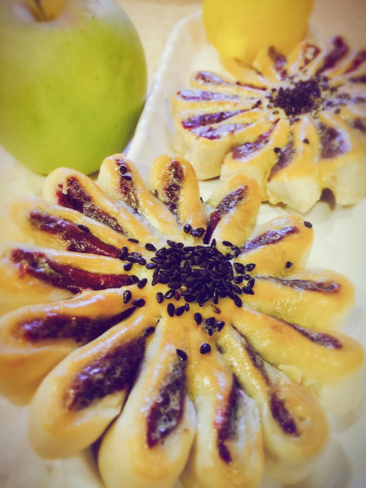 紫薯馅的花式面包:把紫薯馅包入面团,杆开成长圆条,竖着划几条痕,斜着卷起来成长条,再收成圆型,一个收口在上,一个在下