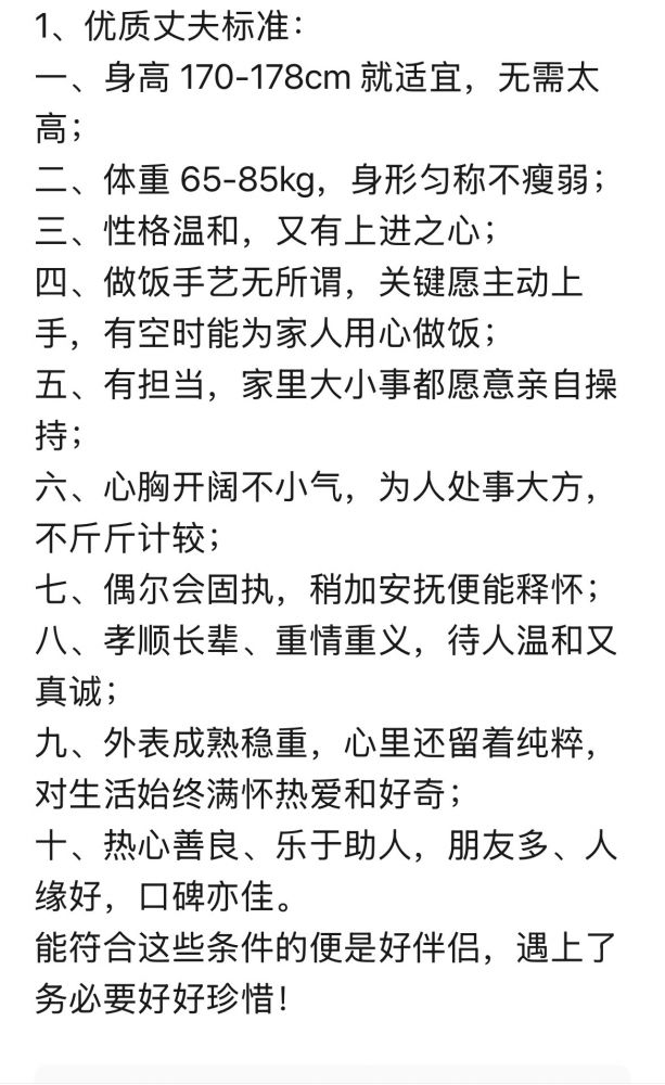 于是,这种“现代男女互助组”便在烟火气中悄然成型。看那份流传的“优质丈夫标准”,一字一句写满的都是生活的功能性:要温润如玉,要洗手作羹汤,要能独当一面。这哪里是在挑选梦中的良人,这分明是在寻觅一位最高等级的“生命合伙人”。男女在理性的天平上给对方打分,试图把婚姻筑成一个稳固的防御堡垒,用来抵御老无所依的冷清。