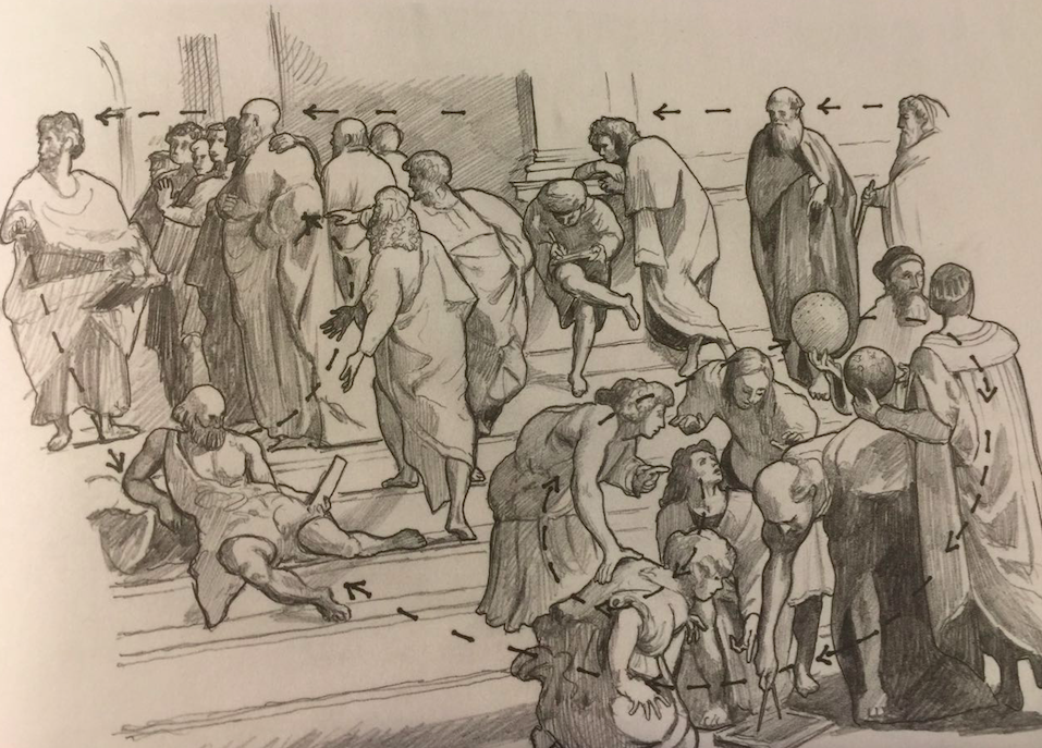 “动”之美显然被忽视了。可能与记录传播手段有关--以前没有视频。无论绘画,还是雕塑,都是某个时间点的切片,只能抓最美的静止瞬间。所以作品一切从简,偶尔的“大画”,就要绞尽脑汁考虑构图,象拉斐尔的“雅典学院”,为了构图的整体性,煞费苦心的用眼神手势去串联整个作品。