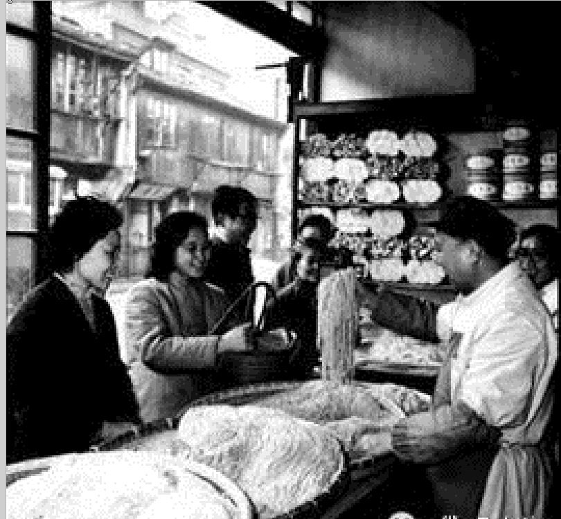 “人山人海的情况还出现在每月的廿六号,因为定量供应,大家都寅吃卯粮,而下个月的粮票可提前在廿六日使用,所以那天必定是一早就有人排队。特别是到了十二月,完结了,因为那天又正好是老毛生日,每家人家无论你愿不愿意,都是一定要买面的,否则就是不忠。米店轧(挤)得来连巨大的柜台都会移动。”
