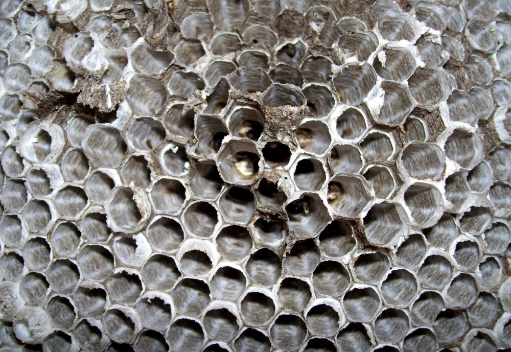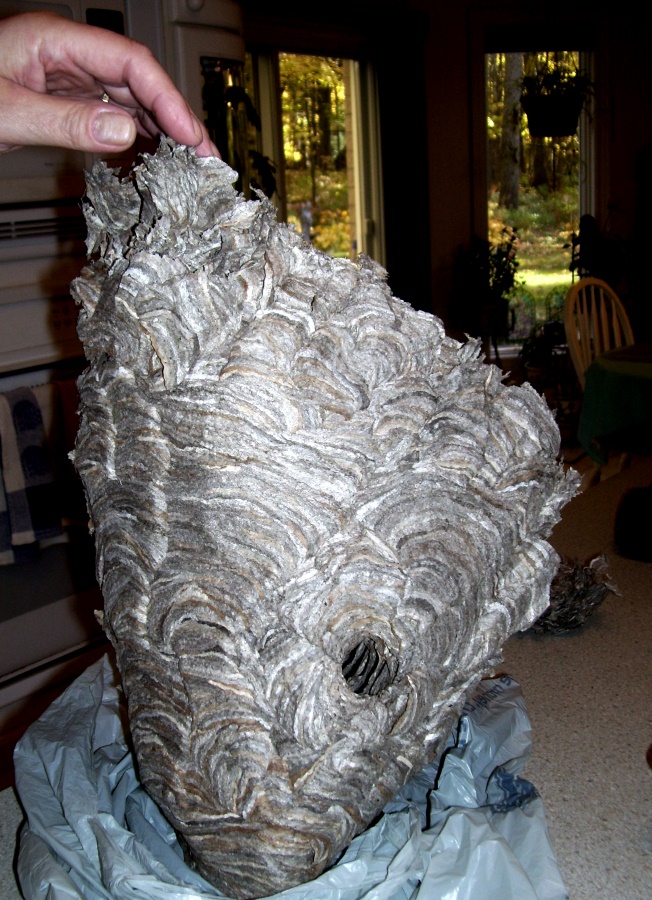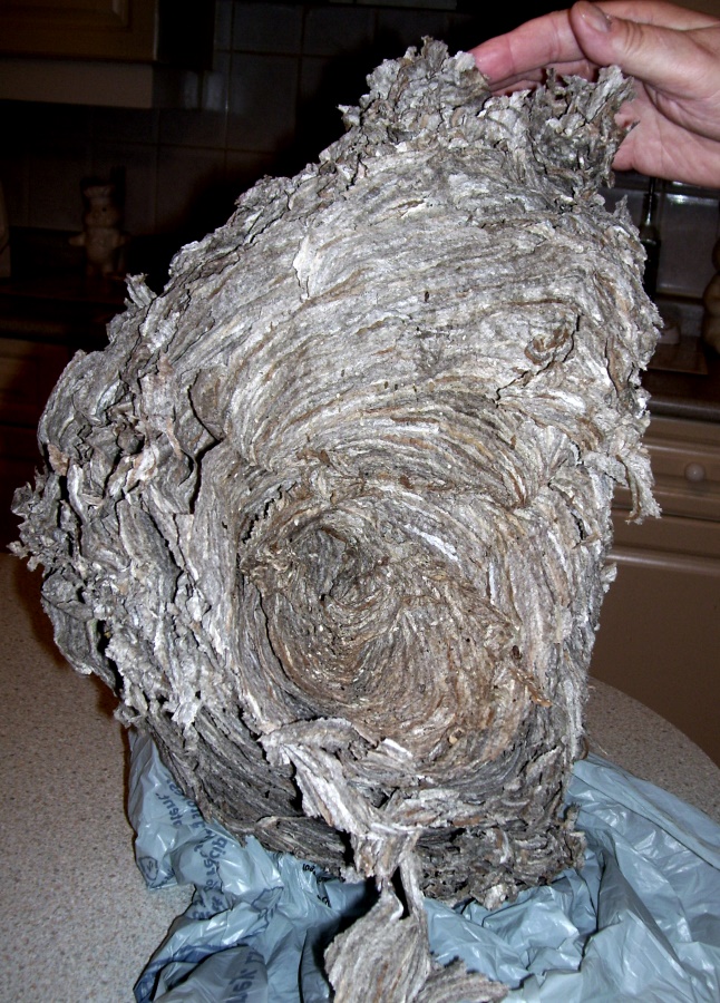 果然,到了十一月初,我们注意到进出的马蜂越来越少,最后安安静静的一只也没有了,想必蜂王也搬出去了。于是我老公用一把长扫帚,从他的书房窗户里伸出去,把这座违章建筑捅了。
