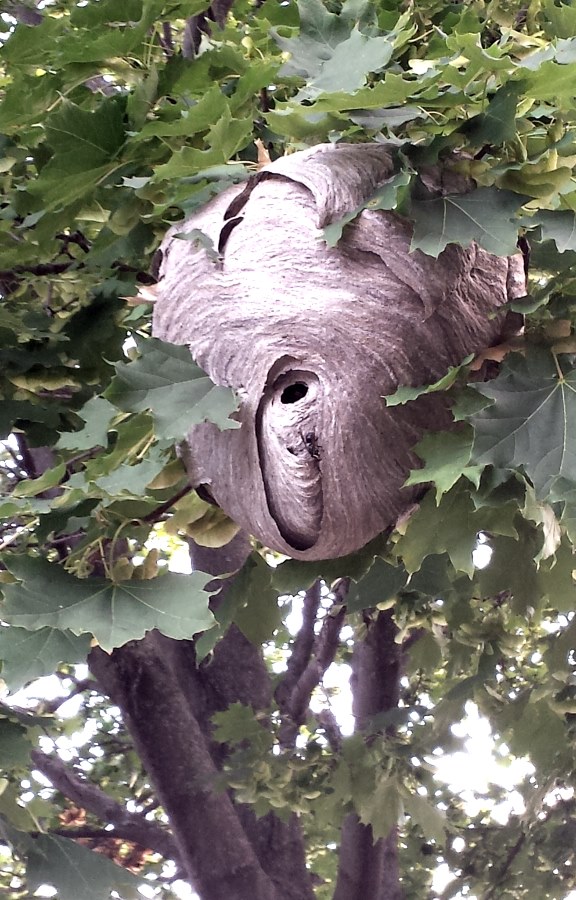 本想请人来端掉这座违章建筑,但想到马蜂在我们这种寒冷的地方是过不了冬的,只有蜂王能存活,它会在树皮或树缝之类的地方过冬,第二年再重整江山,造一个新窝。时令已近秋天,不如暂放它们一条生路,让它们自生自灭,也省了我们的麻烦。