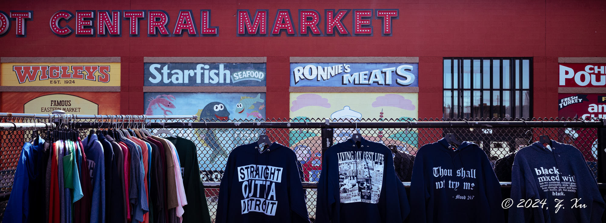 OutsideDetroitsCentralMarket,afencedividescommercefromthestreet.Hoodiesbearingmessagesofidentityandpridehangbeneathpaintedstorefrontsechoesofthecitysindustrialpastandsocialstruggle.Thescenefeelsordinaryyetlayered,aquietrecordofDetroitsresilienceandthefabricofitspeople.