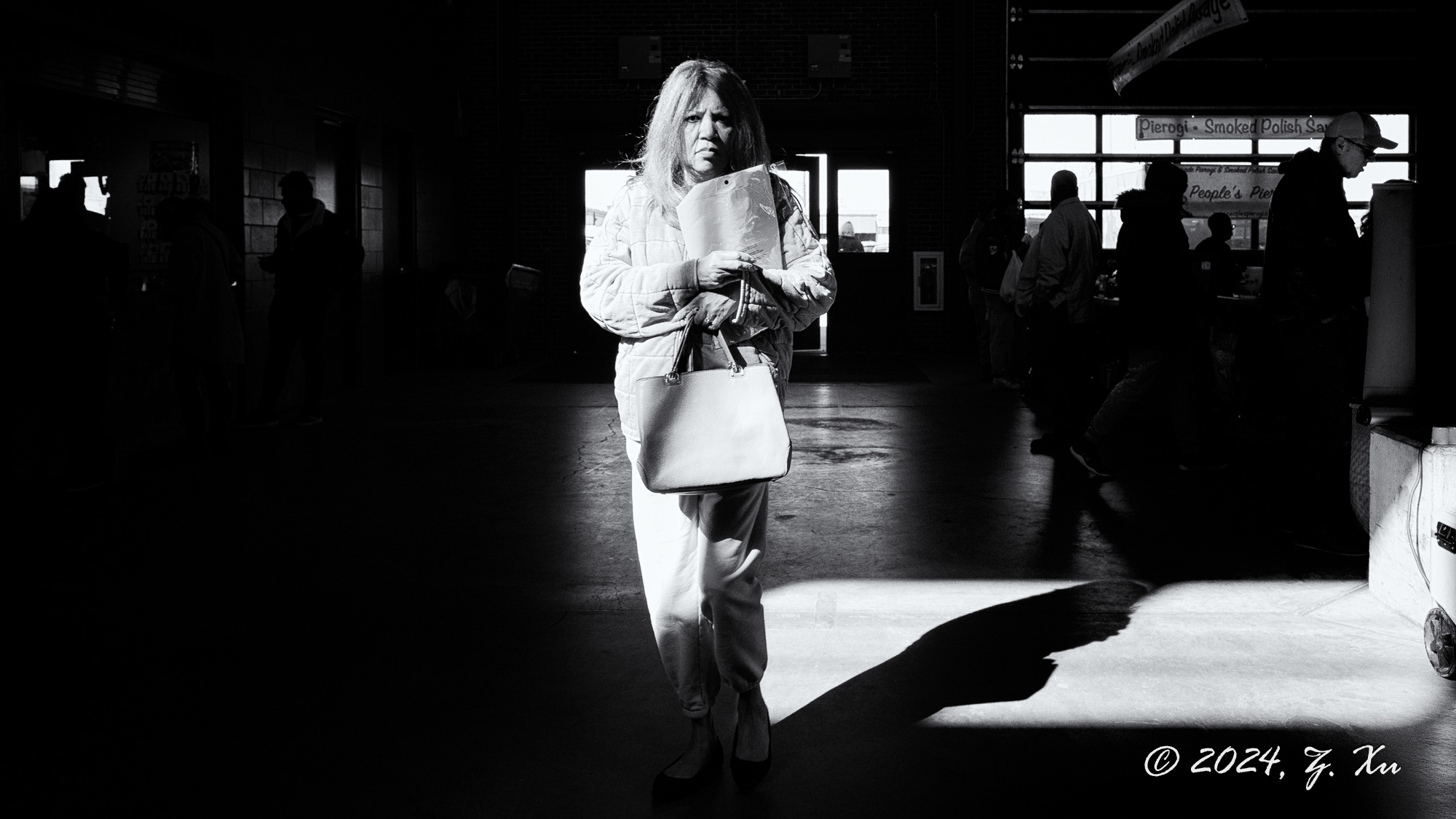 AtDetroitsEasternMarket,abeamoflightcutsthroughthebustlingcrowd,isolatingasinglefigureinquietcontrast.Surroundedbymovementandnoise,sheappearsmomentarilysuspendedinherownworld.Thecoexistenceofbrightnessandshadowreflectstherhythmofthecityitsvitalityandsolitudeintertwined.