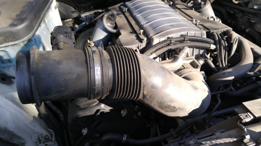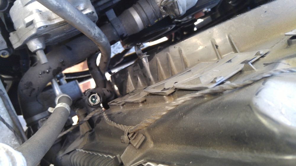 把进气管道靠近发动机端的卡扣松开,把管子顺时针转动,给风扇留出空间,后来发现其实这一步不是必须的,不转风扇也能出来,就是费点劲,为了转管子,我把发动机上边的装饰盖也拆了。因为这次要拆的螺丝不少,怕忘了哪个是哪个,所以我都把螺丝拧回原位,这样装回去的时候虽然多花点功夫,但是也有好处。不会忘了螺丝是从哪里下来的,不会丢螺丝。