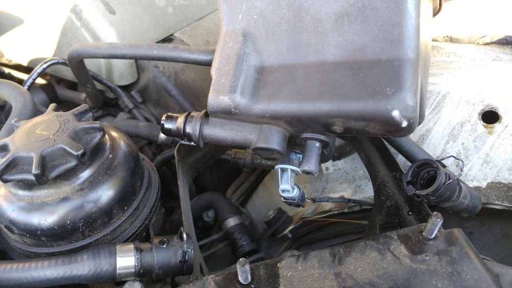 没啥说的,暂停劳动改造,先拆车吧。东西倒是不难拆,一共3个管子,两个在侧面,一个在底下,还有一个液面高度的感应器也在罐子地下。用个尖嘴钳子或者小改锥,把卡扣挑起来,转转管子就下来了。
