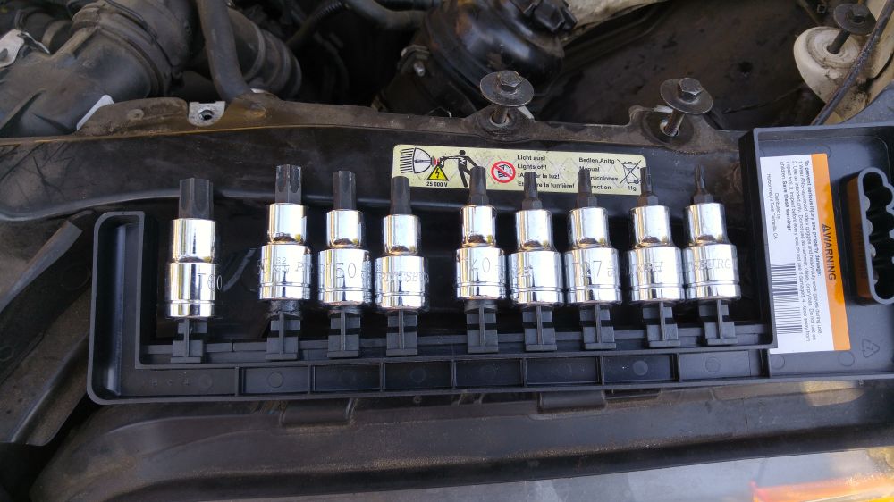 把belt tesioner idler上边的防尘盖子用螺丝刀撬开,露出里边T45的星型螺丝。图里中间那个是大皮带的idler,如果只是拆发电机,转向助力泵,动这个就行了。但是我决定把两条皮带都换掉,就要拆图里最左边的idler。