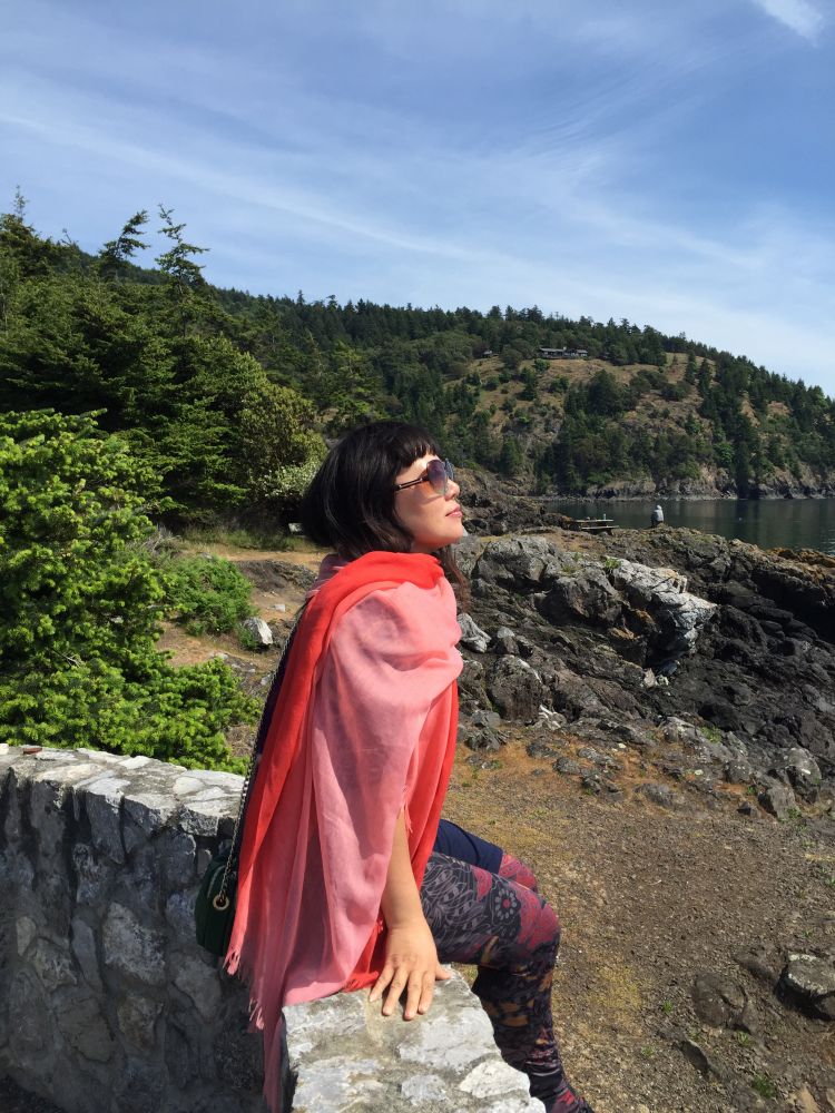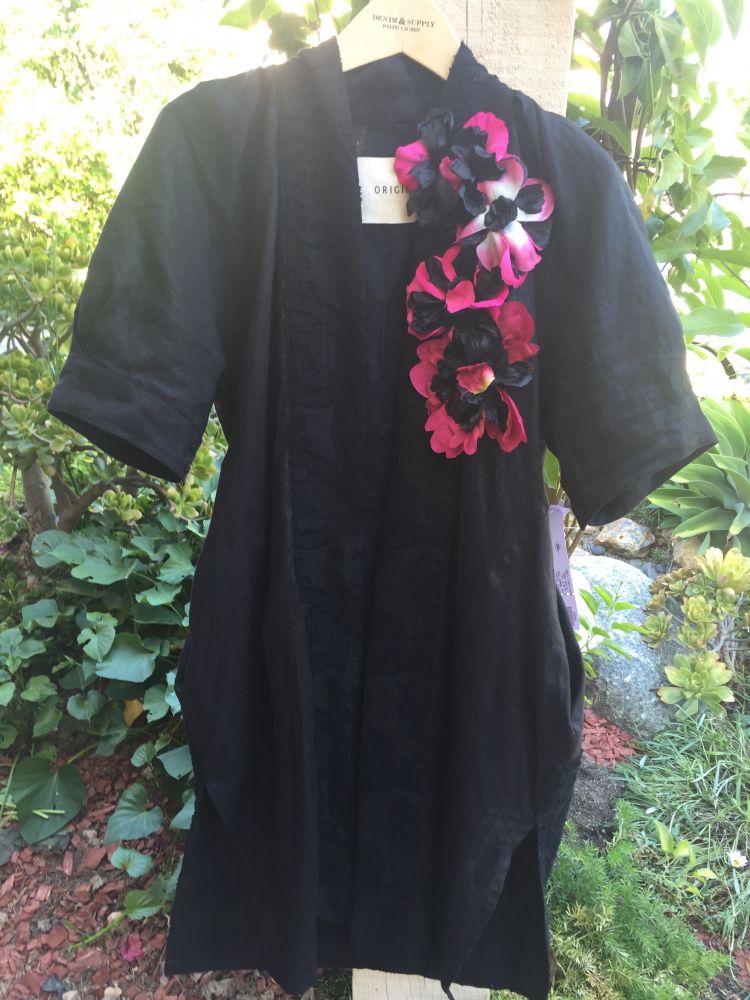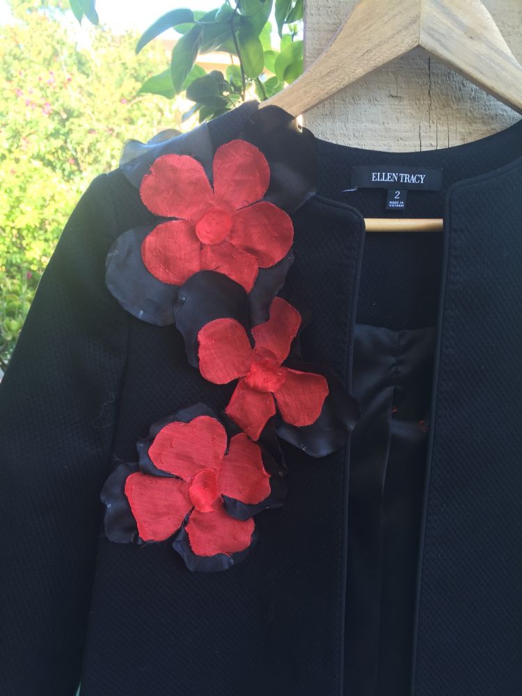 因为从家乡带来的绣片全用完了,只好折了两朵头花,一黑一红拼在一起,颜色不会出错。这件外套的后面有一个大褶皱,当时买这件外套时,我就有了主意安放个什么玩意儿能将这个位置的魅力发挥出来。玫红色的睡莲是几年前我超爱的一朵头花,春夏秋冬,我都会举了她进出。我将她安置到了外套后面的大褶皱里,静态时,一抹艳红,含蓄温婉;动态时,热烈奔放,如盛夏烟花。