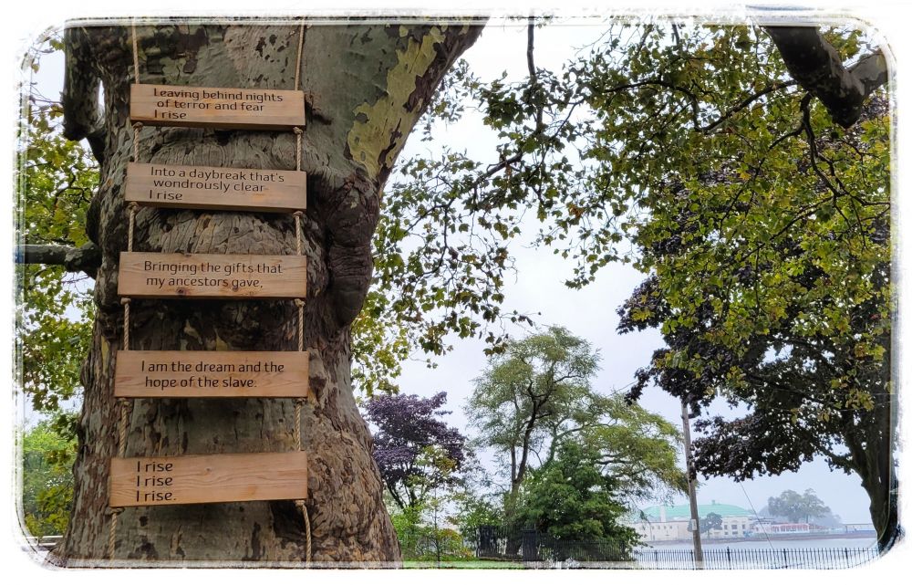 回来的路上,我们穿过草地到停车场。在草地的一棵大树上,用绳子吊着几块小木板,像梯子一样。老公说,这些木板上也有一首诗。真的啊,诗写的是“... ... 我升起,我升起,我升起”。这是美国黑人作家、诗人玛雅·安吉罗的一首诗的最后一段。挂在树上,让诗的含义更丰富。