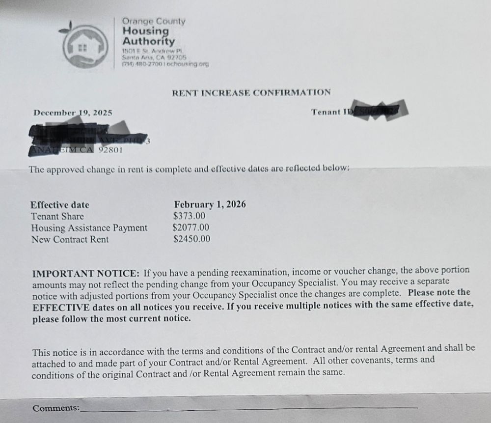 这是我的一个S8房客,也就是政府补助大部分房租。他是残疾人,近乎眼盲。2026年,我这个一房一浴700尺,批准租$2450。政府补助$2077,直接打入我的帐户。房客自己负担$373,每个月邮寄给我。