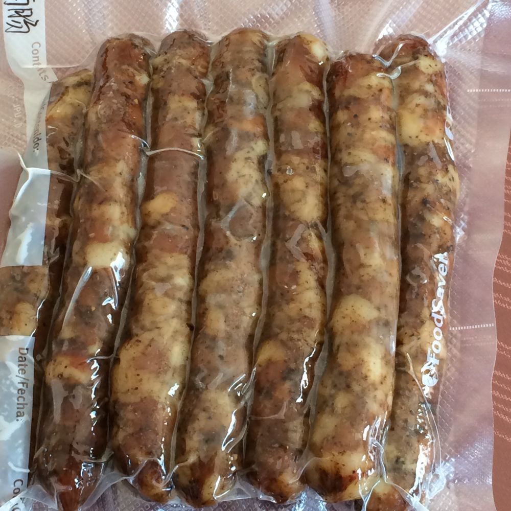 这个香肠绝对是重口味的,是老爸当年下放时跟当地人学的。这种香肠香料多、颜色深、味道咸,吃一口满口香,是以前人们的下酒菜。