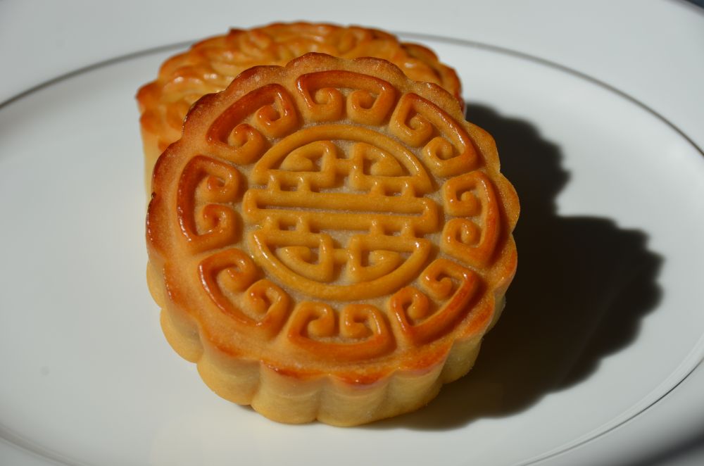 烘焙 烤箱预热350F。将烤架放在上面第二层,月饼表面喷水,入烤箱烤6分钟。取出刷蛋液,降温至325F,再入烤箱烤7分钟。取出再刷蛋液,再烤7分钟。回油2-3天。