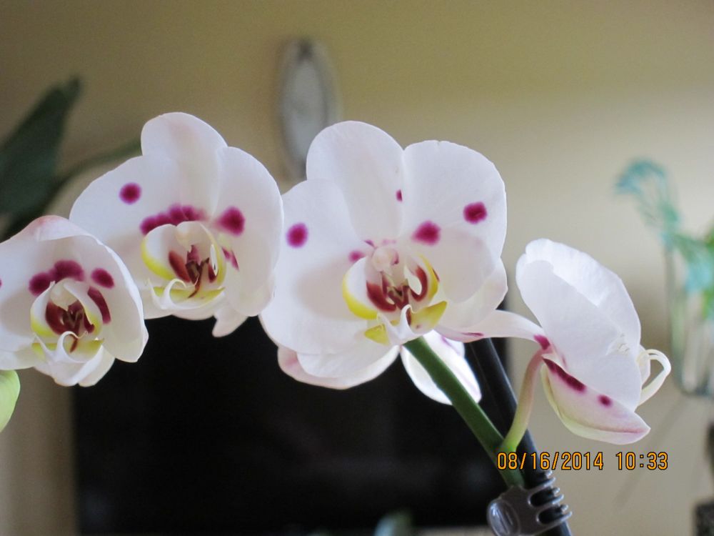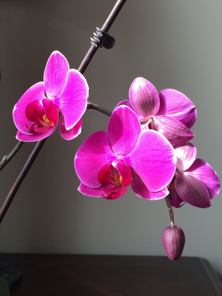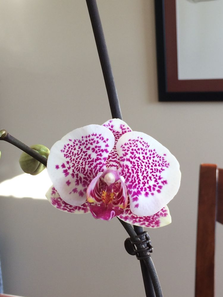 我家第一次买蝴蝶兰是很多年前的事了。在商店里看见她,被她的美丽深深吸引,把她抱回了家。那时我家领导的养花水平还处于黑手党时期,基本只有意志顽强、不屈不挠的花坚强才能在我家勉强度日。话说我家领导如获至宝,每天围着她转呀看的,生怕怠慢了她,换了漂亮的花盆,专门买了Moisture Control 的土,每天好水好肥地伺候着。哪知蝴蝶兰并不领情,没有几天就决绝的去了,只留下还未来得及开的花苞干枯地挂在枝头。第二年、第三年又有美丽的蝴蝶兰在领导的精心呵护下壮烈牺牲。