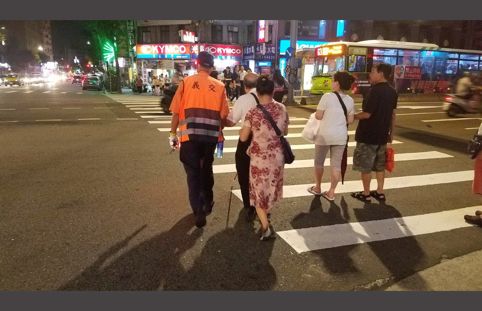 台北车辆多的街口都有义工帮助人过马路。