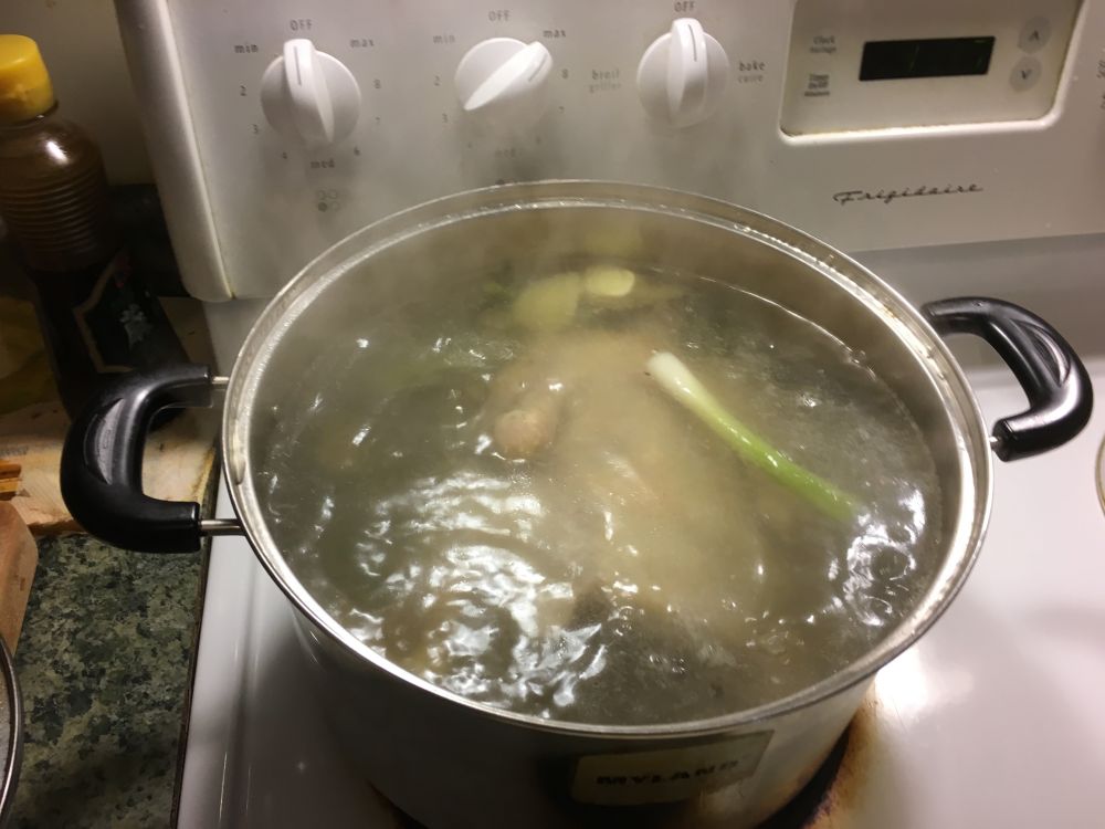 烧开一大锅水,放入葱姜,将鸭坯浸入开水中数秒,再提出,这样反复三次。然后,将鸭坯放入锅中,待水再次开时立即关火。依靠水的温度来“焐熟”鸭子。如果用滚水来烧鸭子,会使得鸭子本身的香味都会流失到开水中,使鸭子失去了原有的鲜香味。而且鸭肉很容易“柴”。