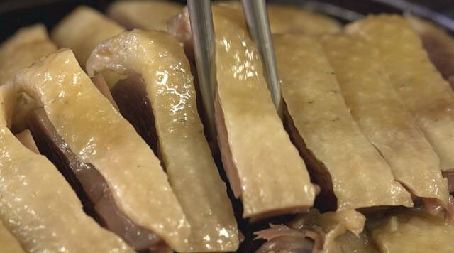 9, 烧制。古法工艺有个专用词叫“焐”。这一步骤最为重要。直接决定鸭子的成色。行话讲好的盐水鸭的成色是皮黄;肉红;骨绿。