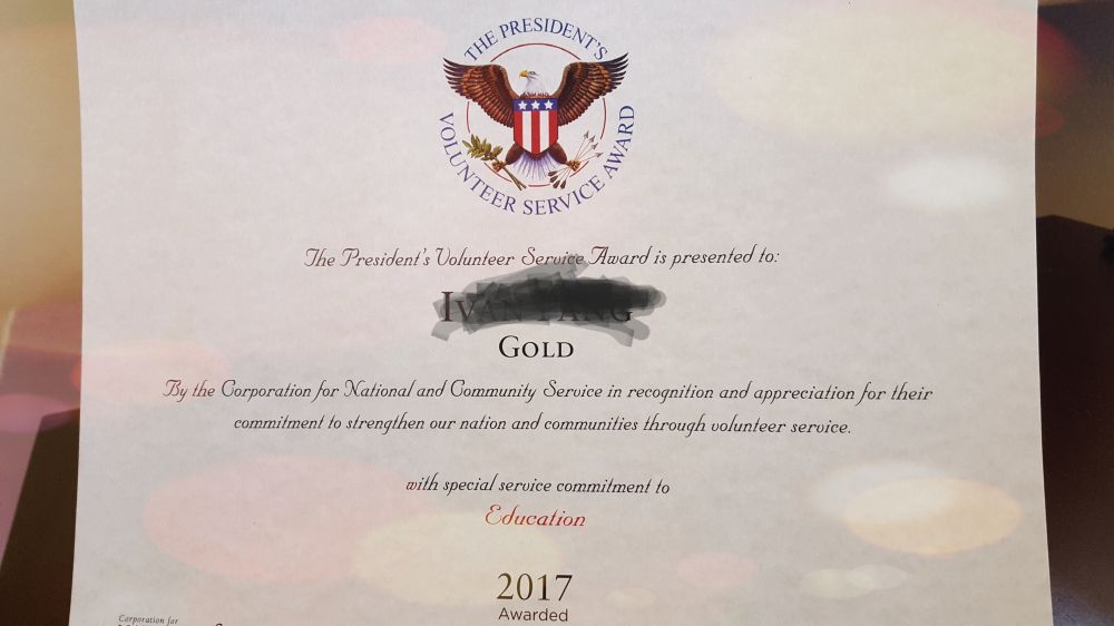 昨晚收到老师的短信,说儿子获得总统义工的金奖。