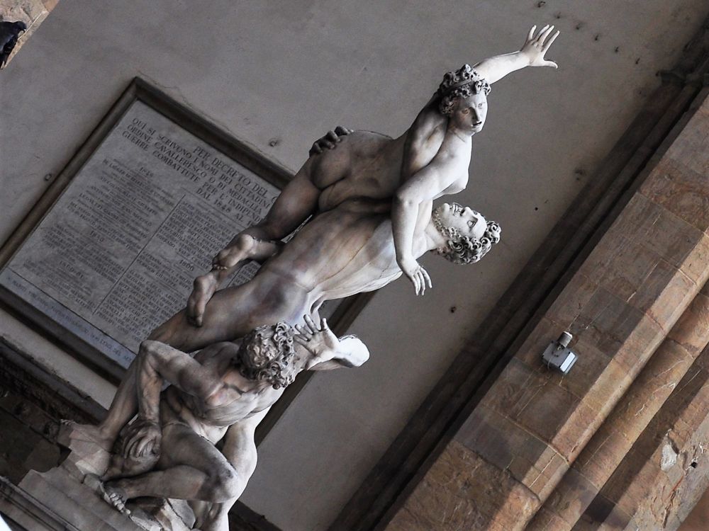 此雕塑名为:‘强掳萨宾妇女’。--故事梗概:萨宾与拉丁同是罗马部族。拉丁族的女性比例太低就从萨宾族去强掳。