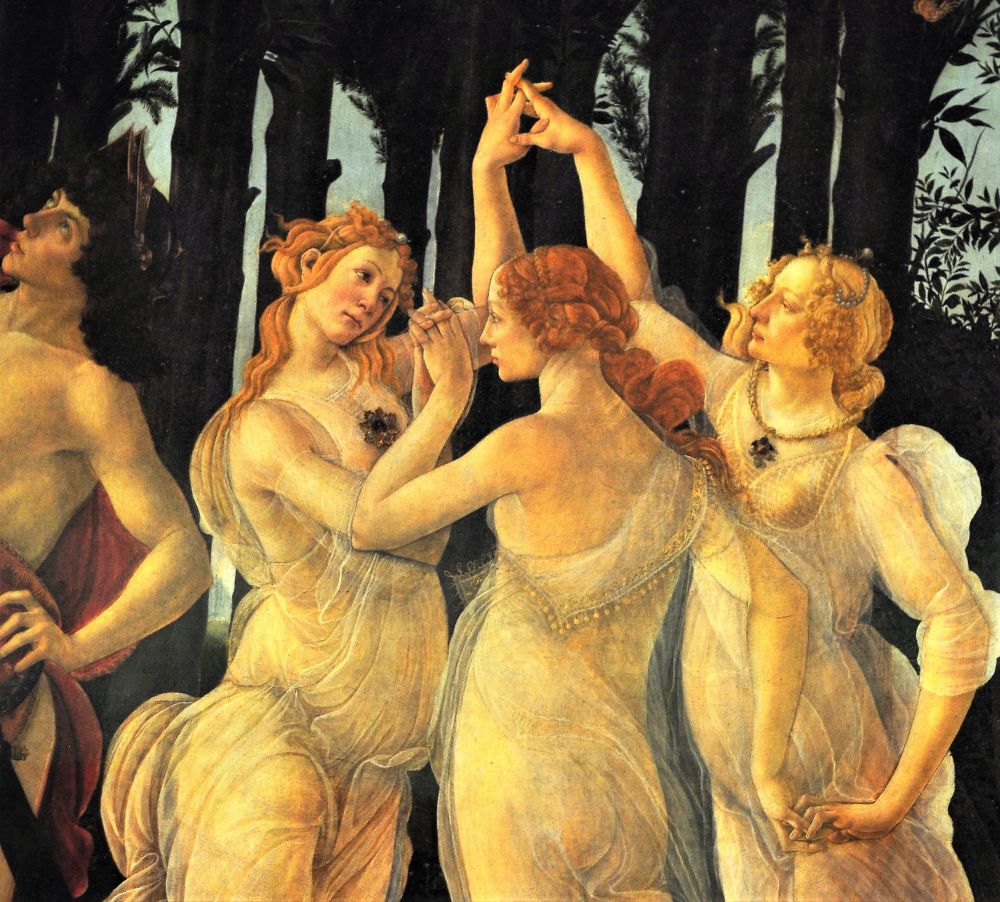 上图是文艺复兴时期佛罗伦萨派著名画家波提切利的画作《春》的一部分,‘美惠三女神’。左边为爱欲,中间为纯洁,第三位是美。三者的关连揭示‘春’的主题。 --我想,这是我们了解文艺复兴精神的的典型版本。