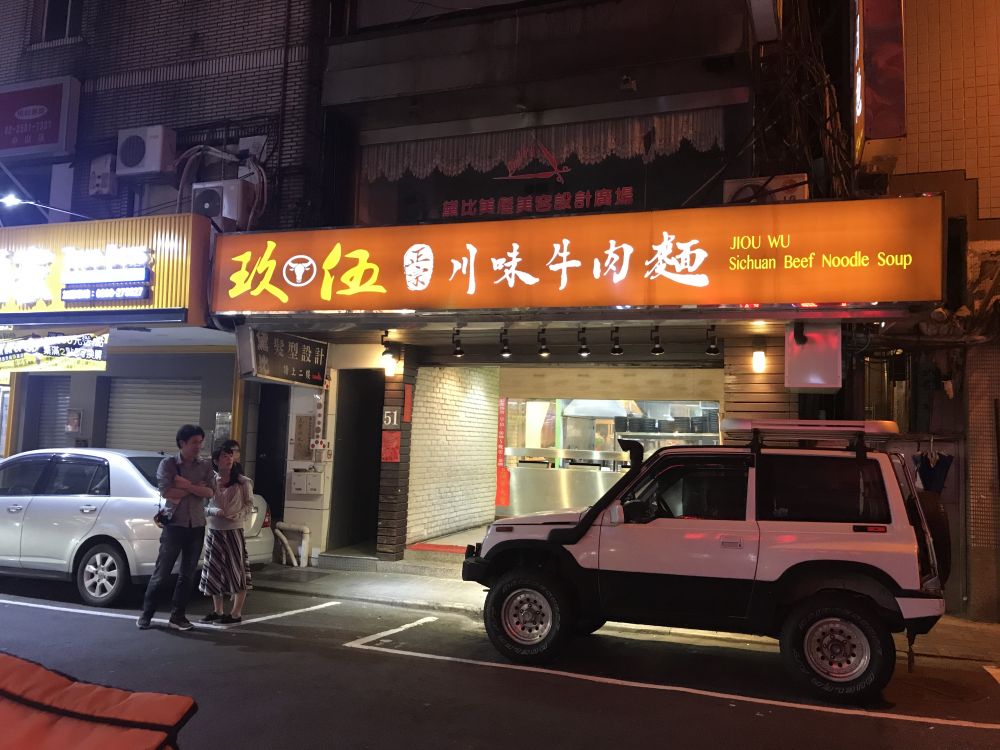 地图上的街道名称是一些多少熟悉却在大陆不多用到的词,复兴路,忠孝东路等等,让人想起忠孝东路走九遍的歌曲。沿着长安东街林森路,经过许多家包括日本料理台湾料理,转上一个小巷在天津街的,找到一家"玖伍川味牛肉面",点莱单自然是繁写体的,墙上的菜单竖写在一条条本板上,联想起古装片里的店景。面的味道不错,牛肉不少,小菜自己从冰箱玻璃窗自己拿,带着淡甜味的冷饮冰水也是自己接,价格比在美国便宜不少,小店铺干净整洁,店员态度冷热均匀,总的来说还是不错。店里大屏电视上重播着"中天综合台"举办的中国好声音歌手比赛,正播着那位曾听过但不记得名字的歌手在唱歌。