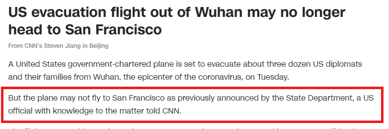 周二,美国政府包机从武汉撤离大约36名美国外交官及其家属,据早先媒体透露,这架航班的目的地是旧金山。
