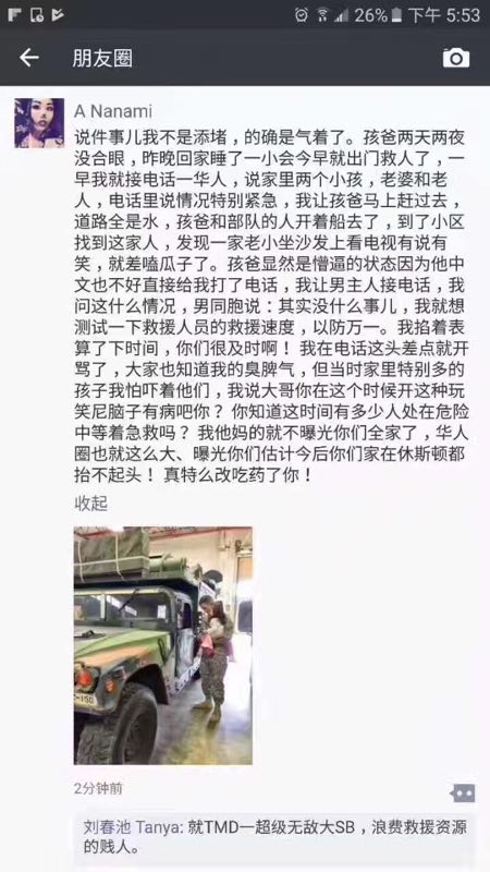 许多华人在这次灾难中被平民自发组织的救援队救出险境。而在平民救援队里,也不乏华人的身影。在今天的《世界日报》的新闻里,我看到了朋友救人的身影,也看到了熟人获救后的笑容。