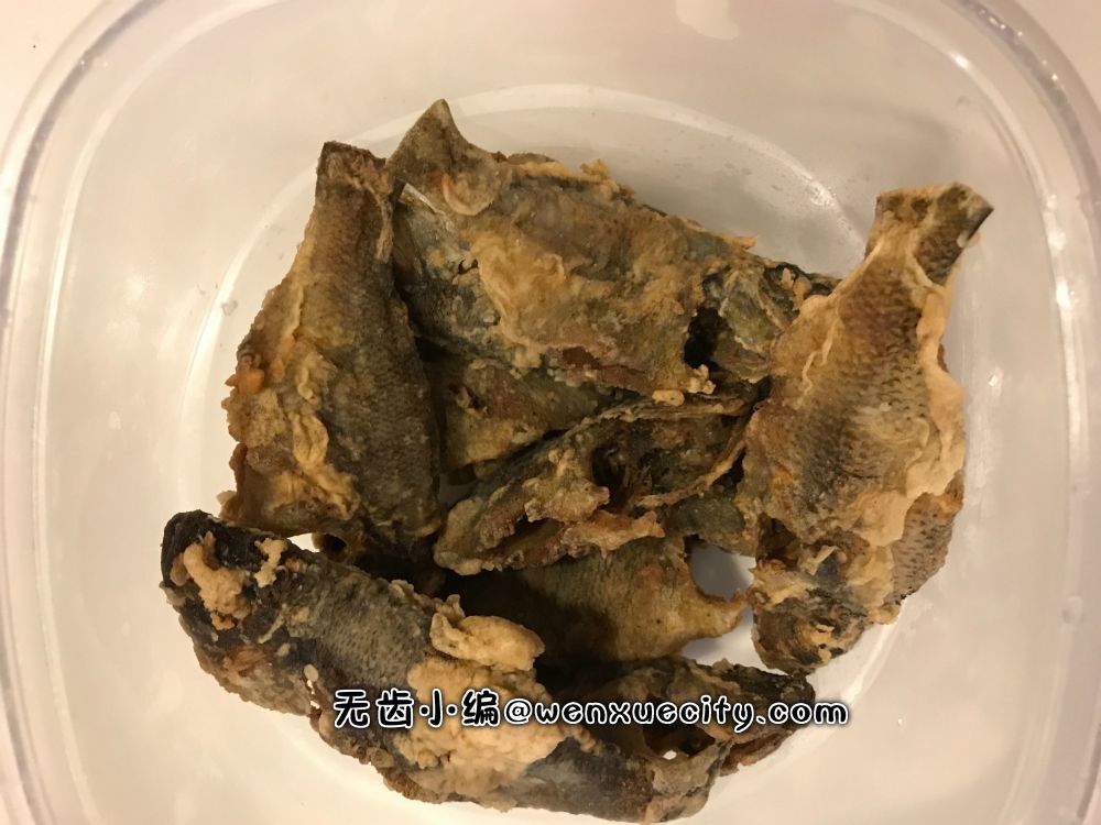 一小锅油,加入花椒、八角和姜片。油热透,下鱼。炸到鱼皮起泡,翻个面继续。一直到鱼被炸得表面酥酥的再捞起来就是美味零食了。