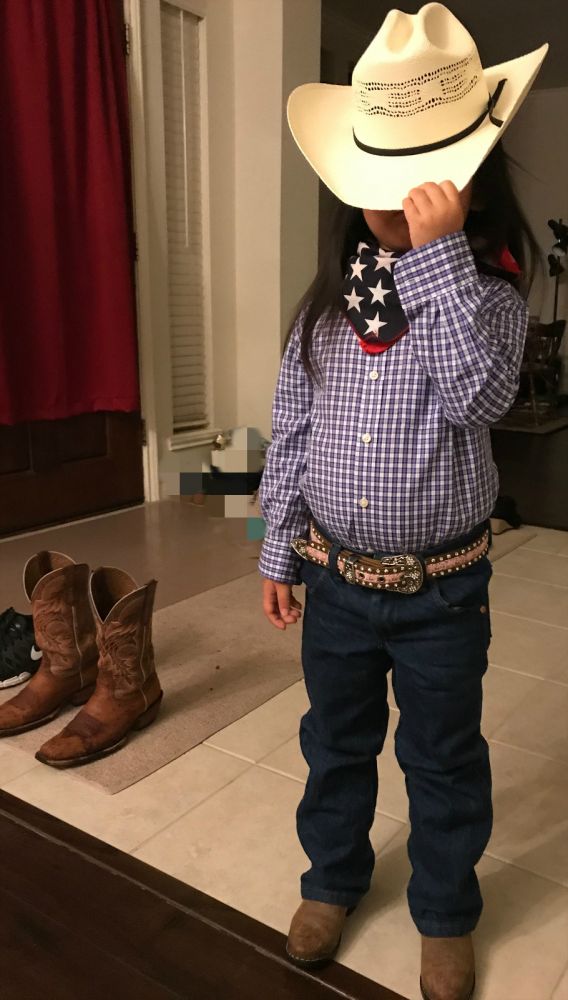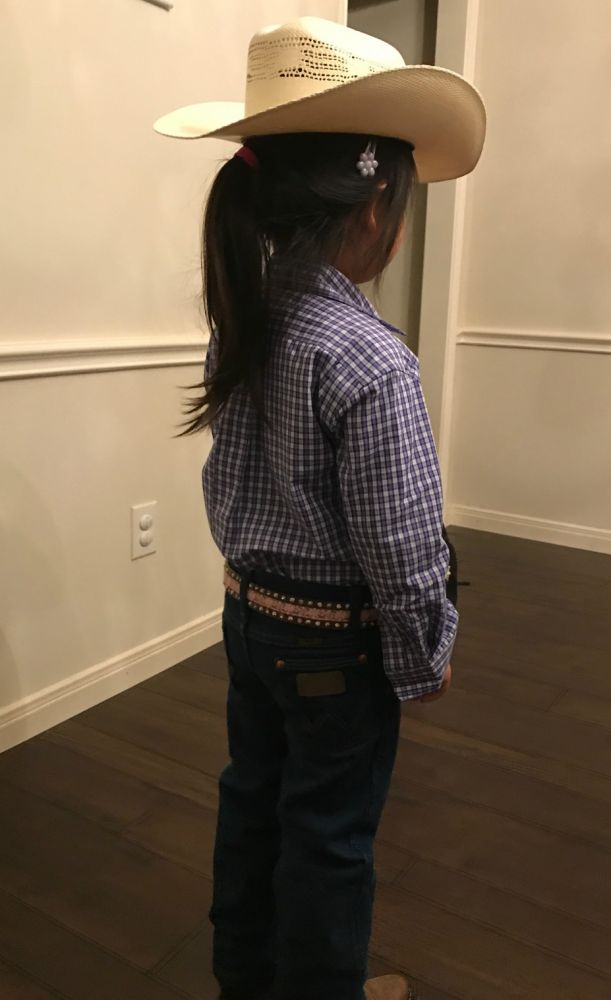 白天,女儿兴高采烈的穿着她的小靴子,戴着她的大帽子出门了。今年在她的要求下,专门给她买了衬衣和wrangler的cowboy cut jeans。她很满意的跟我说,爸爸,我现在和你一样了。