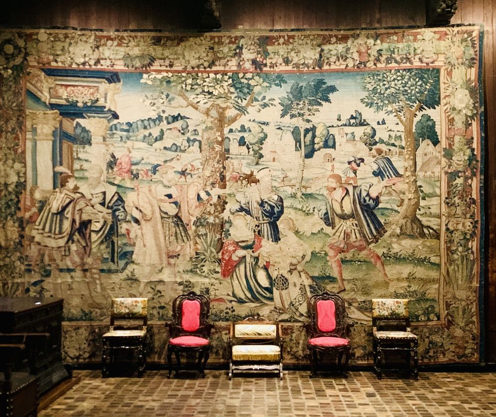 挂毯设计中经常运用华丽的姿态和精致的服饰。人物巧妙地置于风景之中,而这片风景也为故事的其他元素提供了背景。