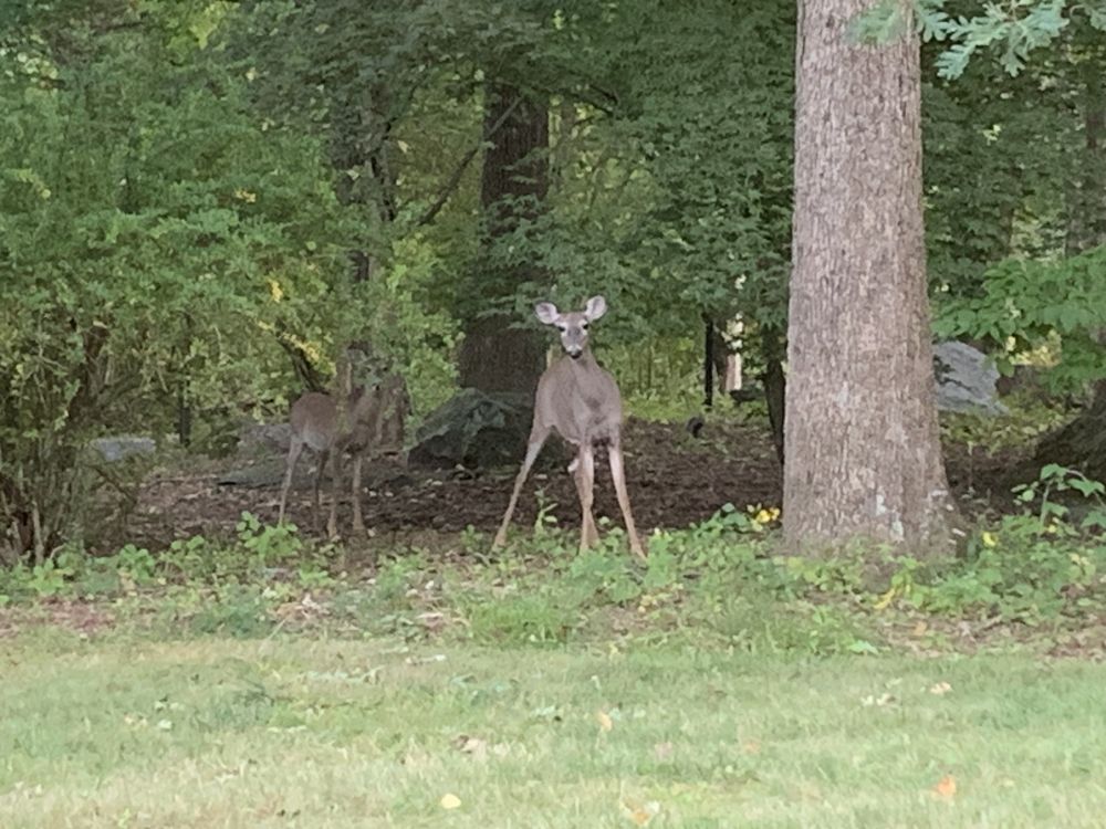 5 走进一条很静的街道。远处偶尔有栋豪宅。还有几只硕大的火鸡。最近不仅火鸡成灾,鹿也成灾了。常在家附近看到。开车必须小心。麻州规定了猎鹿时间段。而且不能用枪。只能用弓剑射杀。因为近年来鹿有病毒。很多人不再猎鹿。造成了到处都是的局面。周六去和J晚餐。开在路上,突然窜出一只高大的鹿。老公踩了一跤brake 但没踩死。车速已经减了下来。鹿也大概过了马路到了边缘。老公试图左转一点从鹿后面绕过去。没想到这大家伙放慢了速度。右前方咣当一声,撞到了鹿屁股。鹿跑了。我们靠边停车。打电话叫来警察。警察叔叔很快来了。先问人没事吧。然后给了一个事故记录的number。说有的保险公司耍赖。有了这个记录,保险公司必须承认。我们随后就开着被撞烂了右前灯和右侧门错位的车去见了朋友。第二天老公开车去保险公司指定的车行修车。车行的人说,你看那里停的一排里面,有五辆是撞了鹿的。最近很常见。