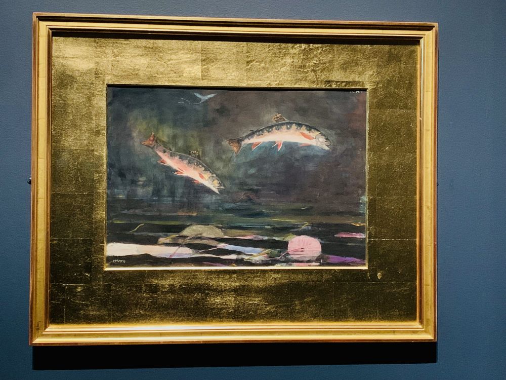 3 《Leaping Trout》红鳟鱼是Homer 第一幅水彩画作品。也是波士顿美术馆收藏的第一幅Homer的作品。两条溪鳟跃出水面,追逐一只蜉蝣。它们悬停在半空中,在即将落水的瞬间,在空灵的背景映衬下闪着光芒。Homer用布或海绵吸走纸面上的湿颜料,营造出蜉蝣幽灵般的轮廓。他还运用多层水彩晕染,营造出深沉神秘的氛围,然后用工具刮去左下角的颜料,漏出纸张,形成纹理丰富的亮部。