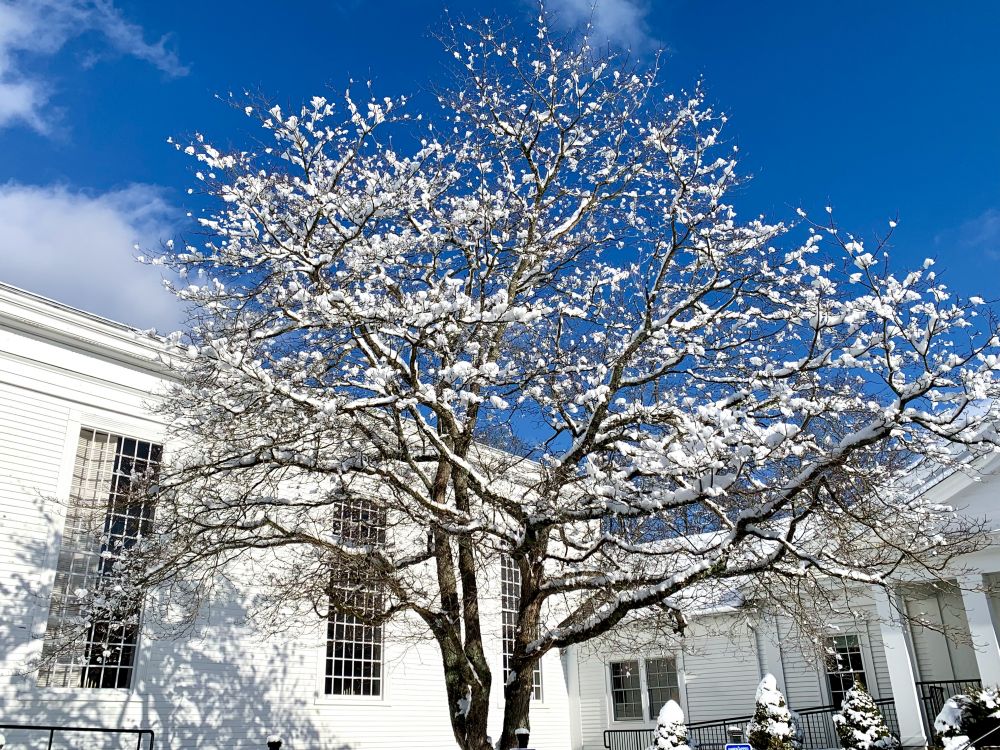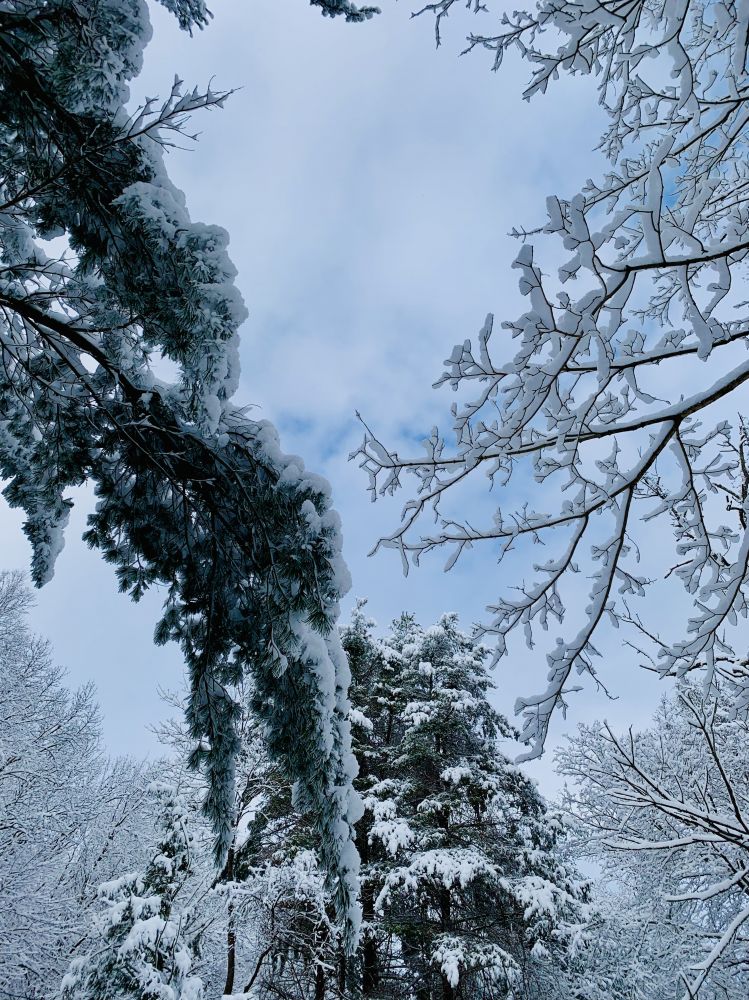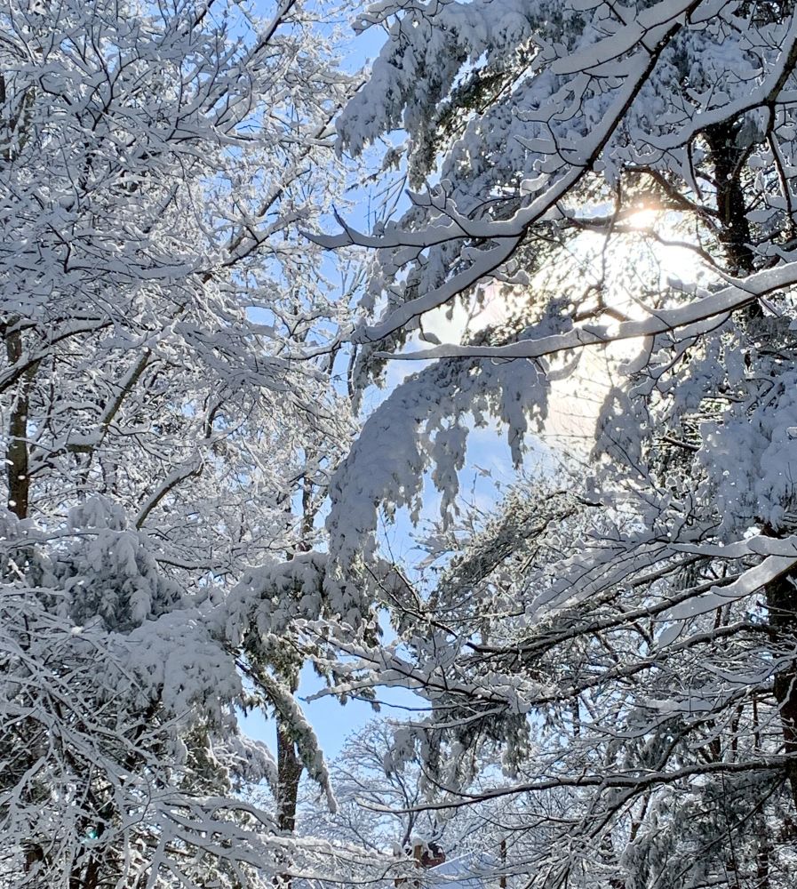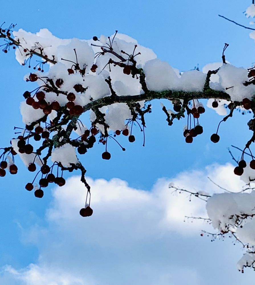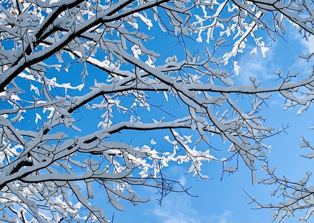 2 咋一看到,虽然有"千树万树梨花开”的瞬间。但是昨晚无风啊。因为无风,飘雪才轻轻地落下。并像棉絮一般挂在了树枝上。